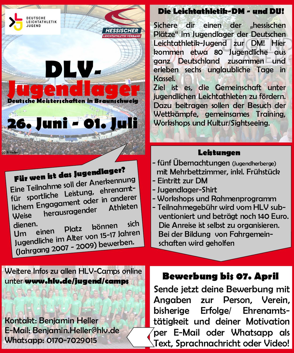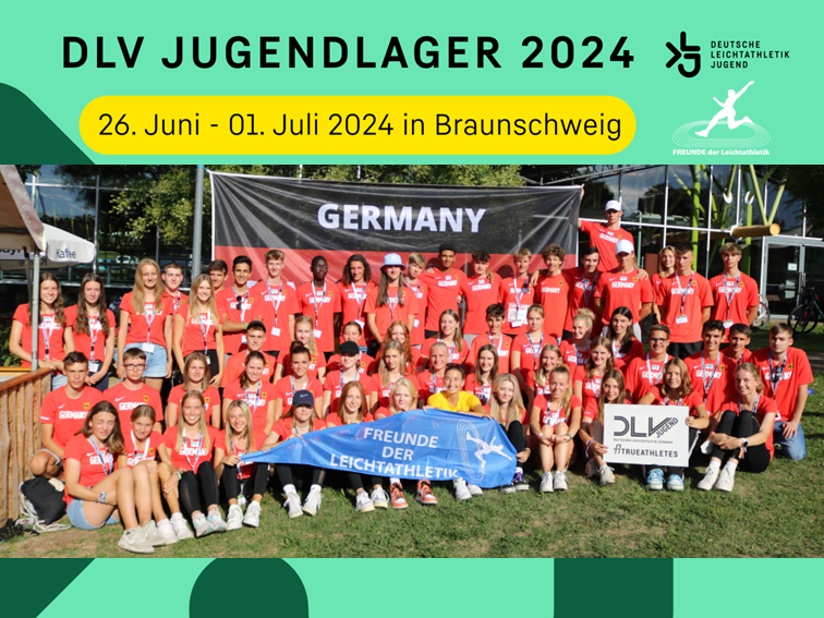 Auch in diesem Jahr findet es statt – das DLV-Jugendlager. Im Rahmen der Deutschen Meisterschaften in Braunschweig kommen hier jugendliche Athlet*innen aus allen Landesverbänden Deutschlands zusammen und verbringen eine sport- und erlebnisreiche Zeit! Der Hessische Leichtathletik-Verband kann vier Jugendliche entsenden und zwei weitere Nachrücker*innen benennen, sollte ein anderer Landesverband seine Plätze nicht aufbrauchen. Dazu schreibt die HLV-Jugend diese Plätze für hessische Teilnehmer*innen der Jahrgänge 2007 bis 2009 aus und freut sich über die Bewerbungen. Das Jugendlager dient der Anerkennung sportlicher Leistung, geleisteter Jugendarbeit oder in anderer Weise herausragender Athleten. Daher wünschen wir uns viele Bewerbungen von interessierten Jugendlichen im entsprechenden Alter! Das DLV-Jugendlager findet vom 26. Juni bis 01. Juli in Braunschweig statt - alle Informationen und Kontaktmöglichkeiten befinden sich im Flyer (siehe rechts).